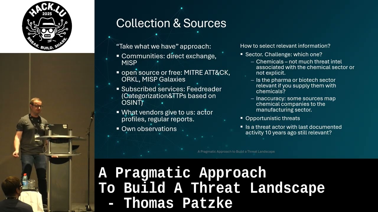 In this talk I will show a pragmatic approach with reasonable-effort for building a technical threat landscape that results in a MITRE ATT&CK map of techniques by utilizing different (open and private) sources and own observations. All techniques are mapped to a relevance that allows to focus further efforts to the most relevant techniques. Furthermore, I will show how this threat landscape can be used to support governance and purple teaming efforts.