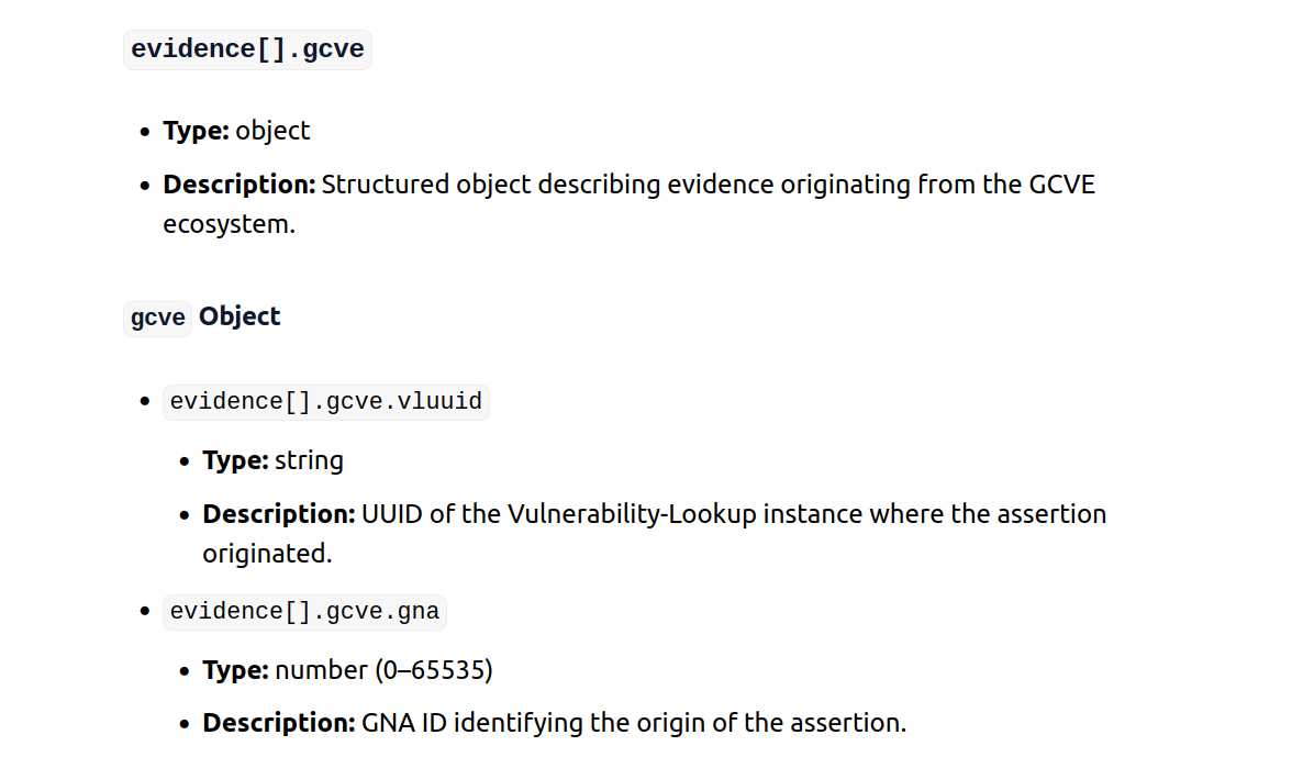 evidence.detailsobject is undefined and open-ended. From an automated data processing perspective, this means unknown fields and data. If the JSON object in thedetailsvaries across JSON records, this creates unparsable JSON at scale (e.g., dropping json into databricks or snowflake, etc). While technically JSON is “machine-readable” inconsistent JSON objects are challenging to be machine-parsable across records. This is fine if I am pulling up a single record in python I can visually inspect and adjust for that record, or maybe do some tests checking if some fields exist vs others, but it creates an insurmountable challenge while ingesting thousands of records to store in a tidy data format. - this may be lack of knowledge about GCVE in general, but from the schema defines “severity” and it’s 0-100. The only time I’ve heard “severity” used is when CVSS pretends they aren’t measuring risk, but that’s 0-10. I couldn’t find any details in the KEV docs here either.