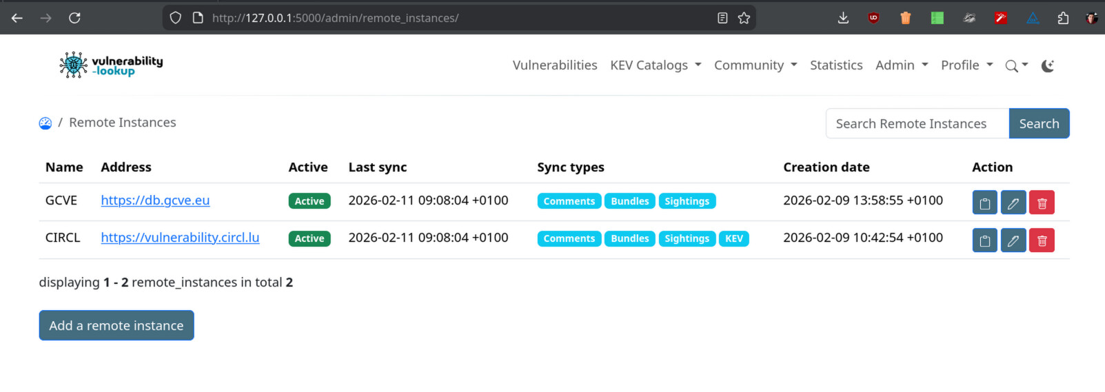 This feature will enable synchronization between instances, allowing a local instance to pull objects (bundles, comments, sightings, KEV entries) from configured remote Vulnerability-Lookup instances via their public APIs.