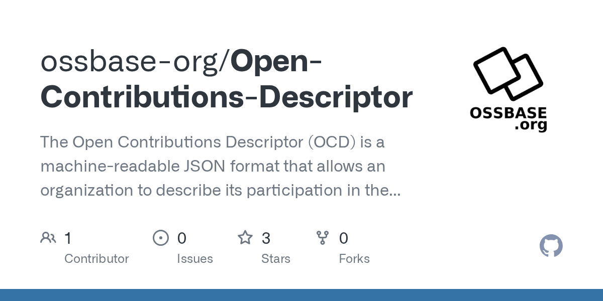 The Open Contributions Descriptor (OCD) is a machine-readable JSON format that allows an organization to describe its participation in the open ecosystem, including: