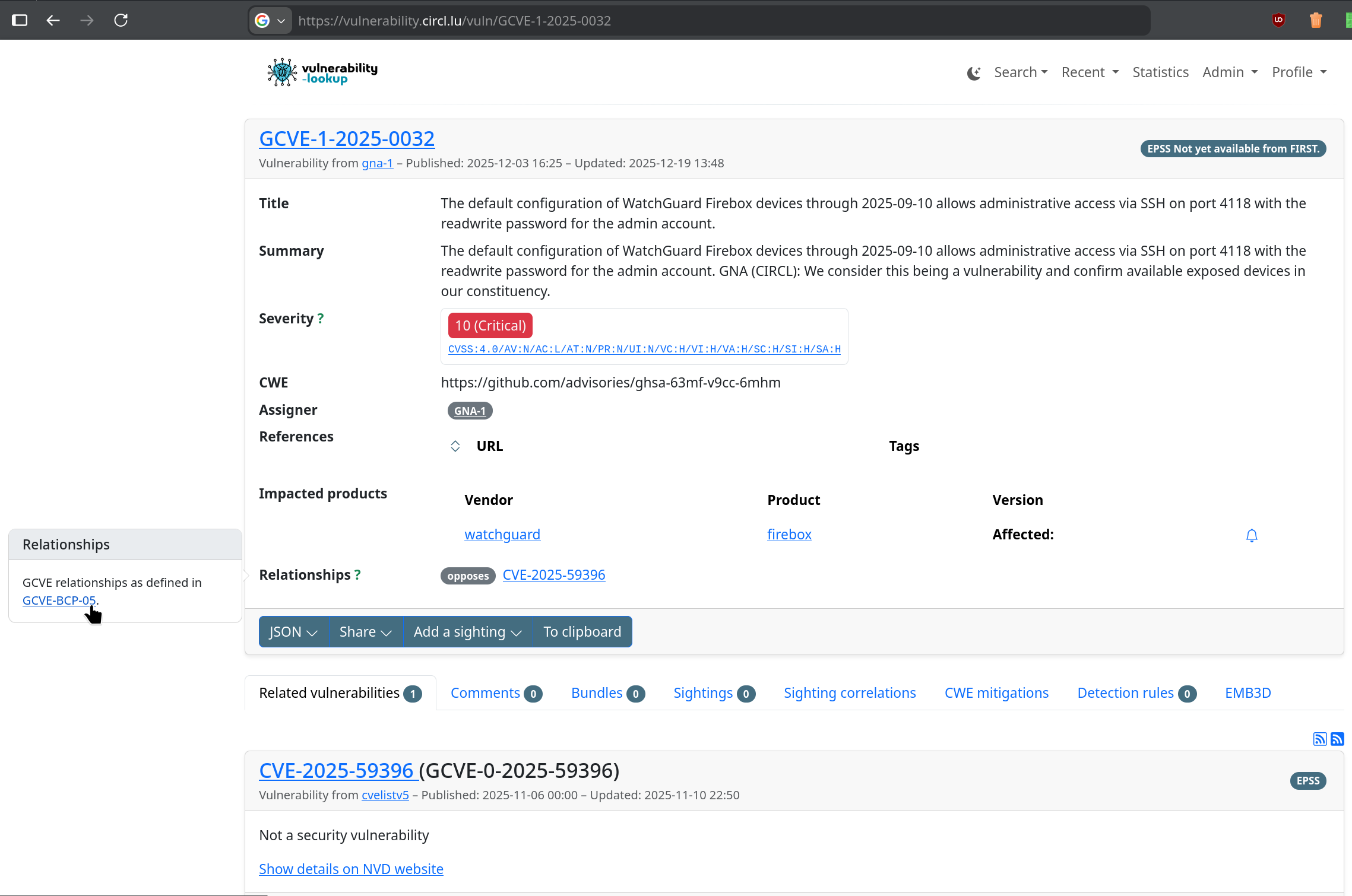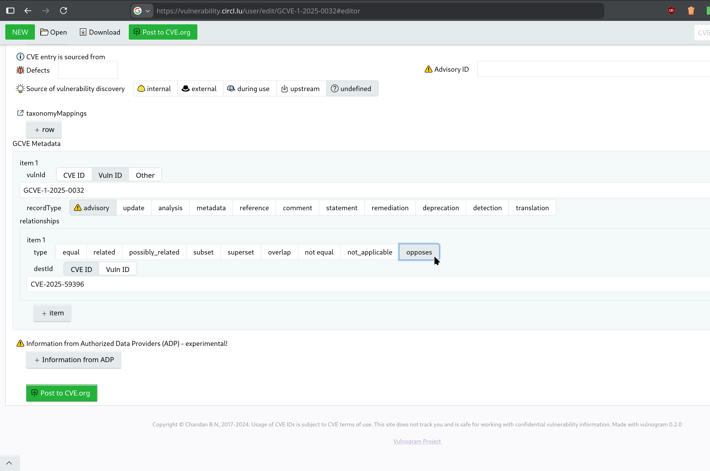 - new: [gcve] Updated Vulnogram in order to define relationships (GCVE-BCP-05 - GCVE Vulnerability Format (Updated CVE Record Format) – GCVE - Global CVE Allocation System) in the x_gcve field. 2f39bf8